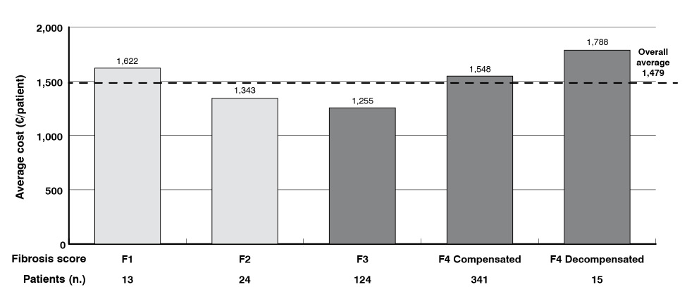 Key evidence from cost driver analysis is related to differences between F3, F4 compensated and F4 decompensated. An average F3 patient would in fact cost about 30% less than an average F4 decompensated one. Costs for F1 and F2 patients from the study are not representative of the general population (exceptional clinical record: liver transplant or severe extrahepatic diseases), but it can be reasonably expected they would be even lower than average F3 patient costs.