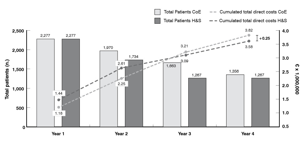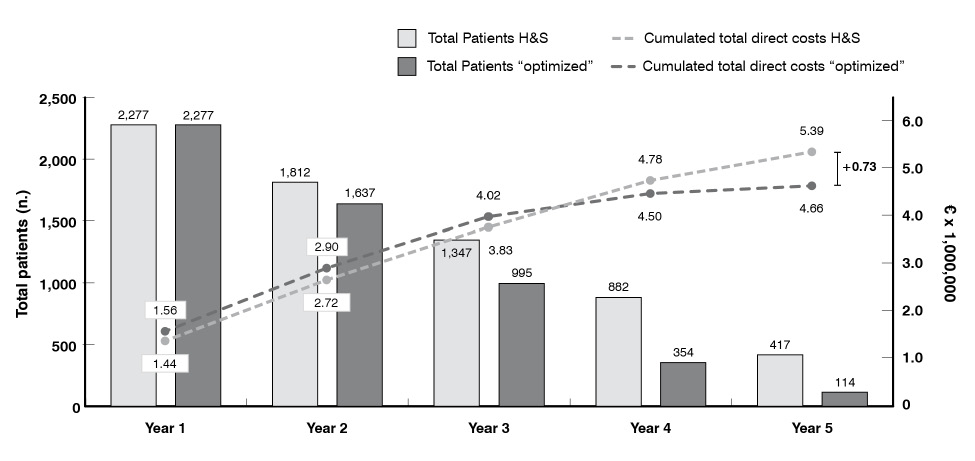 Finally, we compared “optimized” and Hub&Spoke considering new AIFA access criteria. We observed that the implementation of optimization opportunities generated additional benefits firstly in terms of treatment capacity. In fact, specialist workload would decrease by 15% and annual access capacity would increase by 28% (755 patients vs. 579 of Hub&Spoke). Thus the “optimized” model would deplete the waiting list in 2.9 years only, roughly 1.6 year (-35%) less than Hub&Spoke. Once again, a shorter waiting list leads to cost savings: “optimized” model costs are equal to € 4.6 M over three years, showing an additional saving of € 0.7 M (-13%) versus Hub&Spoke (Figure 4).