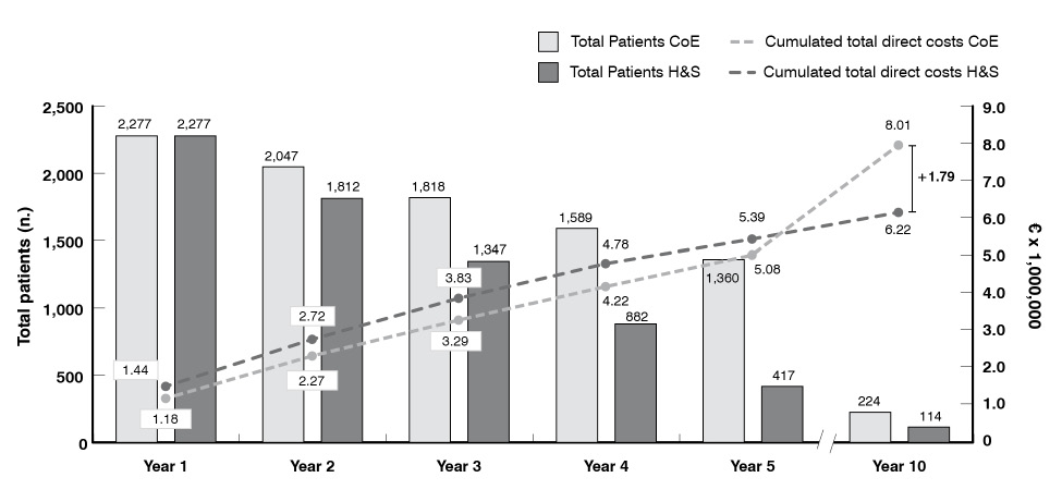 We firstly compared CoE and Hub&Spoke considering AIFA limited access criteria effective until March 30th, 2017. Hub&Spoke is capable of treating a higher number (≈ +70%) of patients over 12 months (579 vs. 343). Waiting list is consequently shorter for Hub&Spoke: 10 months for Hub&Spoke compared to 27 months for CoE. In terms of direct costs, cost per treated patient does not significantly differ between the two models (albeit it would be possible to infer that costs sustained by patients and caregivers are lower in Hub&Spoke, thanks to hospital proximity). We also observed a correlation between treatment capacity and cost efficiency: in fact, while over one year Hub&Spoke reported higher costs for treated patients (≈ +70%) due to the larger number of treated patients, it displayed lower costs for deferred patients (€ -83,000) thanks to a shorter waiting list. Cost savings of lowering the waiting list clearly increase over time in the Hub&Spoke model: considering the same number of patients will be eventually treated by both models, total direct costs down to waiting list depletion equal to € 3.82 M for the CoE and € 3.58 M for the Hub&Spoke model, with the latter generating a saving of € 246,813 (Figure 2).