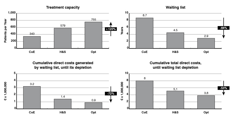 Waiting list depletion was defined as the point in time (with month granularity) when the number of untreated patients would be equal to or below zero. Waiting list depletion was used as a proxy of disease elimination’s timing in the hospital’s area. Therefore, an organizational model with a higher treatment capacity would display a smaller waiting list, as well as a shorter time to waiting list depletion and disease elimination.