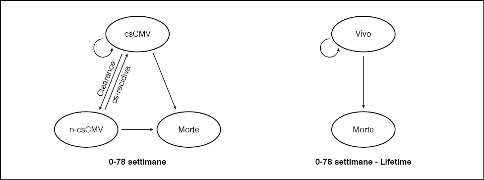 Un modello di Markov a due stadi è stato identificato come il metodo più appropriato per descrivere il percorso clinico di un paziente con infezione o malattia da CMV post-trapianto, refrattaria o resistente al trattamento antivirale convenzionale. Il modello è risultato dunque caratterizzato da due fasi: 0-78 settimane (Fase 1) e 78 settimane-lifetime (Fase 2) [48]. La fase 1 inizia con l’insorgenza dell’infezione o della malattia da CMV post-trapianto e comprende un modello di Markov a tre stati di salute: infezione da CMV clinicamente significativa (csCMV), infezione da CMV non clinicamente significativa (n-csCMV) e morte. Tali stati di salute identificano e stimano adeguatamente la clearance del CMV e la recidiva clinicamente significativa (rispettivamente l’endpoint primario e secondario dello studio clinico SOLSTICE). La fase 2 include un modello di Markov a due stati (vivo, morto).