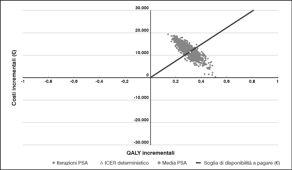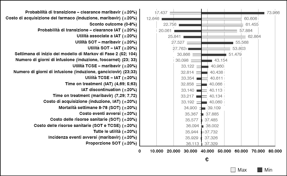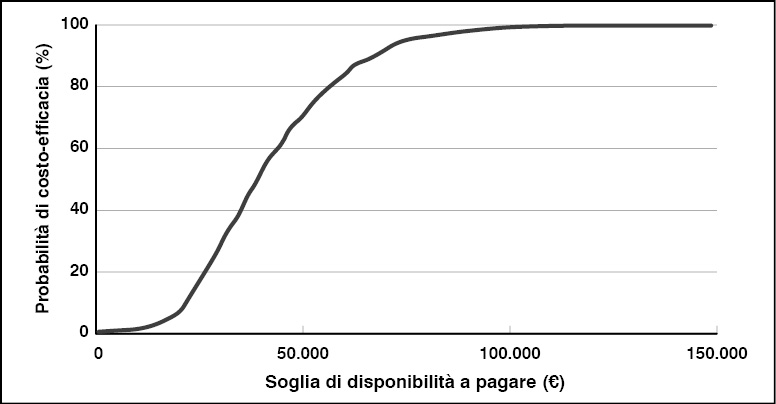 L’analisi è stata condotta secondo un orizzonte temporale lifetime (47 anni). Poiché l’età iniziale della coorte era pari a 53 anni, si è ritenuto che un orizzonte temporale pari a 47 anni potesse rappresentare una buona approssimazione dell’orizzonte temporale lifetime. Il modello economico ha restituito, per ciascuna opzione di trattamento in analisi (maribavir e IAT), una stima dei costi diretti sanitari totali ed una stima degli anni di vita aggiustati per la qualità (QALY). L’ICER risultante dall’analisi è stato valutato considerando la soglia di disponibilità a pagare per QALY guadagnato attualmente considerata a livello nazionale per i farmaci orfani e pari a circa € 37.000 [49]. Sia i costi, sia gli outcome sono stati scontati a un tasso annuo del 3% come comunemente assunto in questo tipo di analisi.