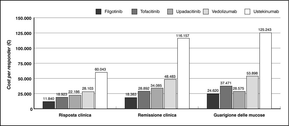 RESULTS: According to the model results, the treatment associated with the best clinical response at 1 year was vedolizumab (69.6%) followed by filgotinib (60.9%) and upadacitinib (60.1%). Despite differences in efficacy, filgotinib resulted in the lowest cost per responder, in every outcome, compared with all the other alternatives. The same trend applies when observing results at the end of the induction phase only. Results were robust to probabilistic sensitivity analyses, filgotinib has a posterior probability to be better than the other alternatives higher than 96% according to all the three response definitions (CR, CRe, and MH).