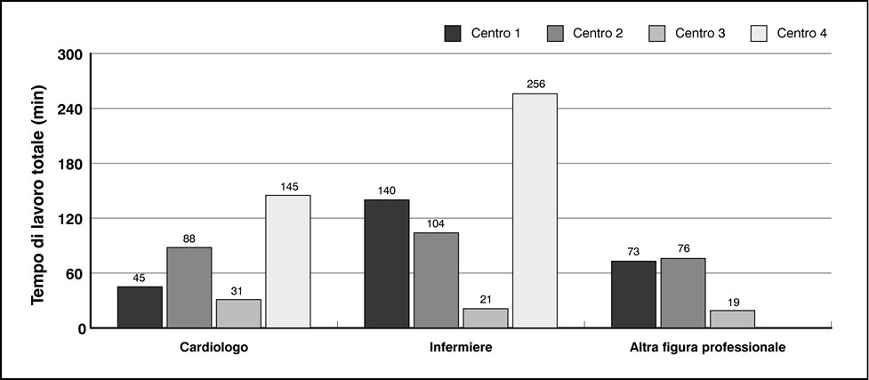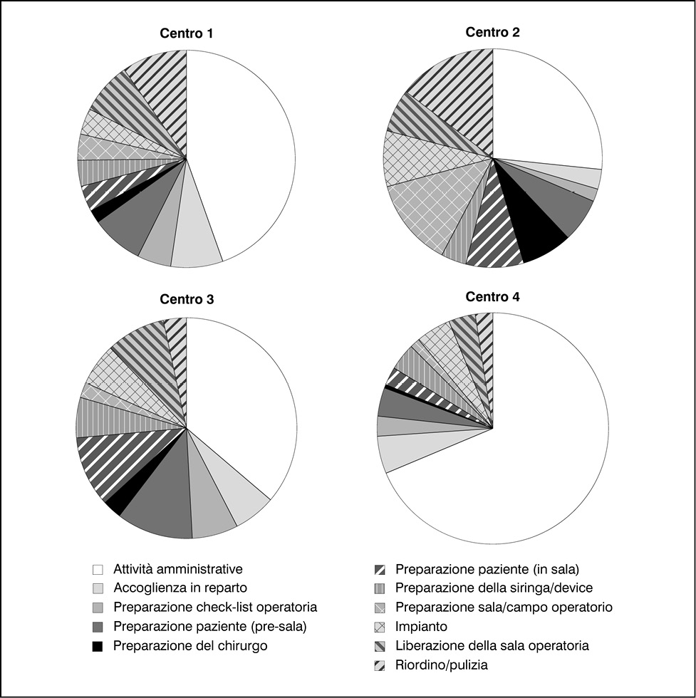 Il consumo di risorse è stato misurato mediante la tecnica bottom-up activity-based con suddivisione del processo nelle principali attività (fasi) di cui è composto e misurazione per ognuna del tempo di lavoro dedicato dalle diverse figure professionali e dei materiali di consumo (Tabella I). Ad ogni centro è stato chiesto di registrare il tempo di lavoro e i materiali utilizzati durante 5 impianti, selezionati casualmente tra quelli effettuati in una sessione di routine.