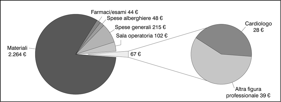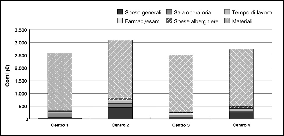 È stato valorizzato anche il costo di utilizzo della sala operatoria, compreso di ammortamento per le attrezzature presenti in sala; questo costo generalmente dipende dalla durata di occupazione della sala operatoria e dalla complessità dei materiali e degli strumenti disponibili all’interno di essa. I costi unitari sono stati forniti dall’amministrazione delle strutture ospedaliere; per le sale operatorie più complesse sono stati individuati e attualizzati dati derivanti dalla letteratura scientifica. Nei casi in cui il tipo di laboratorio/sala non sia stato indicato, sono stati applicati costi medi riportati dagli altri centri. Per i centri che non hanno riportato la durata media di occupazione della sala, questa è stata calcolata sommando il tempo di preparazione del dispositivo e del campo procedurale, il tempo per preparare il paziente (all’interno della sala operatoria) e il tempo per l’intervento e per la pulizia finale della sala.