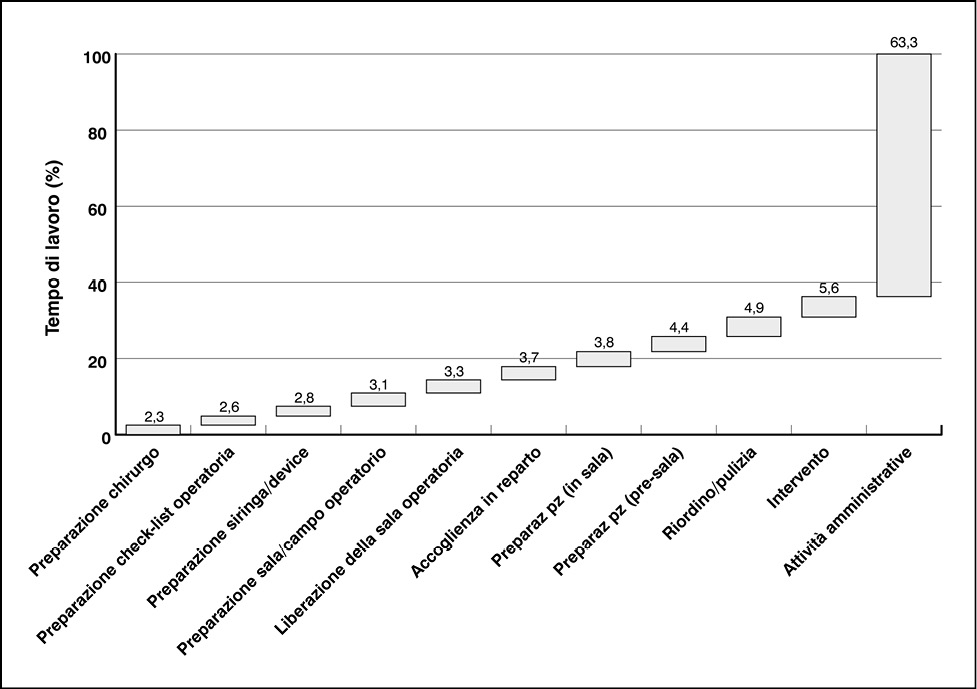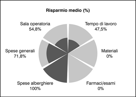 I dati sono stati raccolti da parte di medici esperti e dalla direzione amministrativa, attraverso la compilazione di uno strumento strutturato. Sono state raccolte informazioni circa il tipo di sala operatoria e la lunghezza di occupazione della stessa, la durata totale della degenza nella struttura ospedaliera (LOS), la tipologia di ricovero (ricovero diurno o ordinario) e il consumo di risorse per l’intero percorso di cura (dall’ingresso del paziente in struttura alla sua dimissione).