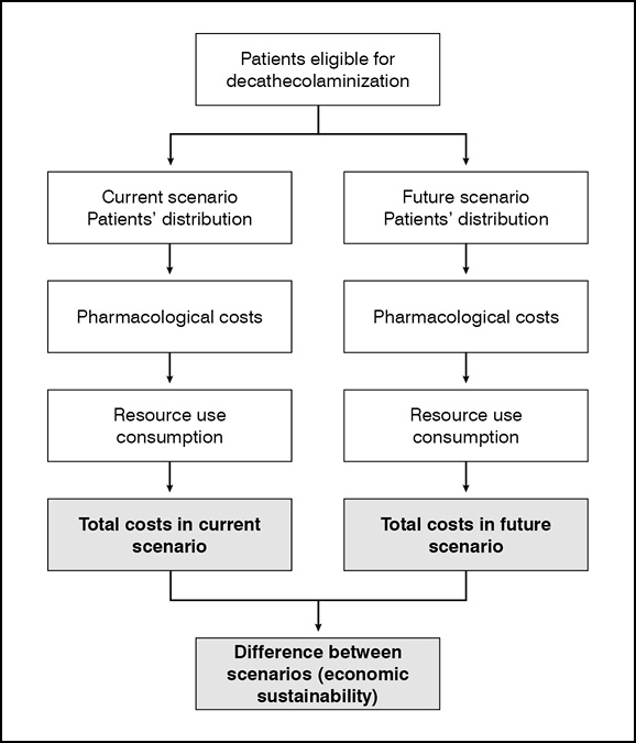 Starting from the patient-level analysis, a pharmacoeconomic model was developed to extend the analysis to the Italian population. The cohort-level analysis compares a current scenario, in which decatecholaminization is not or scarcely considered as treatment option for patients with septic shock, and a future scenario, where decatecholaminization is introduced among treatment options (Figure 1). The analysis was conducted from the Italian NHS perspective.