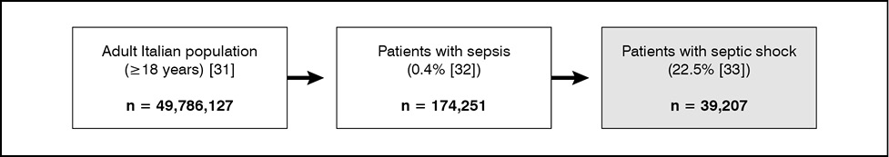 Due to the limited availability of scientific literature and the impracticality of basing the analysis on only two real-world cases, three clinical experts in the fields of anesthesiology and reanimation were consulted to validate the input data for the analysis. In particular, the clinical experts (n = 2 Directors of the Department of Anesthesia and Intensive Care and n = 1 Hospital Pharmacist) supported in the definition of the patient population, validation of the patient treatment pathway and additional resource consumption. The eligible population was calculated starting from the adult Italian population [31] and applying the rates of patients with sepsis [32], and septic shock [33]. Overall, approximately 39,000 eligible patients were eligible to the treatment with decatecholaminization. Figure 2 illustrates the patient population funnel employed to calculate the eligible pool in the scenario analysis [31–33].