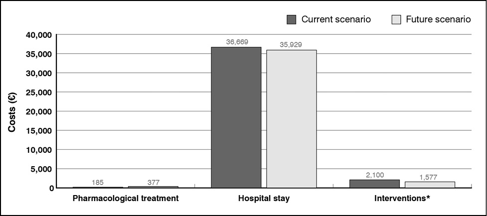 The results obtained in the cohort-level analysis are illustrated in Figure 4. Similar to the patient-level analysis, the use of decatecholaminization leads to a slight increase in pharmacological costs (+€192 per patient) but delivers a significant reduction in the costs related to other healthcare resources consumption (-€1,264 per patient). The main driver of cost reduction is the costs related to the hospital stay.