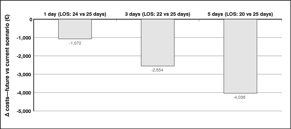 In the cohort-level analysis a conservative hypothesis of 1-day hospital stay reduction in the future scenario was considered, resulting in a cost reduction of -€1,072 per patient. However, estimating a potential reduction in atrial fibrillation rate of 25-30% [34,43,44], a further decrease in hospital stay could be anticipated. The implementation of decatecholaminization led to incremental cost reduction proportional to the reduction in hospital days, with reductions of 3 and 5 days resulting in cost reduction of -€2,554 and -€4,036 per patient, respectively (Figure 5). Applying this reduction to the entire eligible population, a total cost reduction of -€101 million and -€159 million could be achieved, with 3 and 5 days reduction, respectively. These findings offer valuable insights into the potential benefits of decatecholaminization, laying the foundation for further investigations on its impact on patient outcomes.
