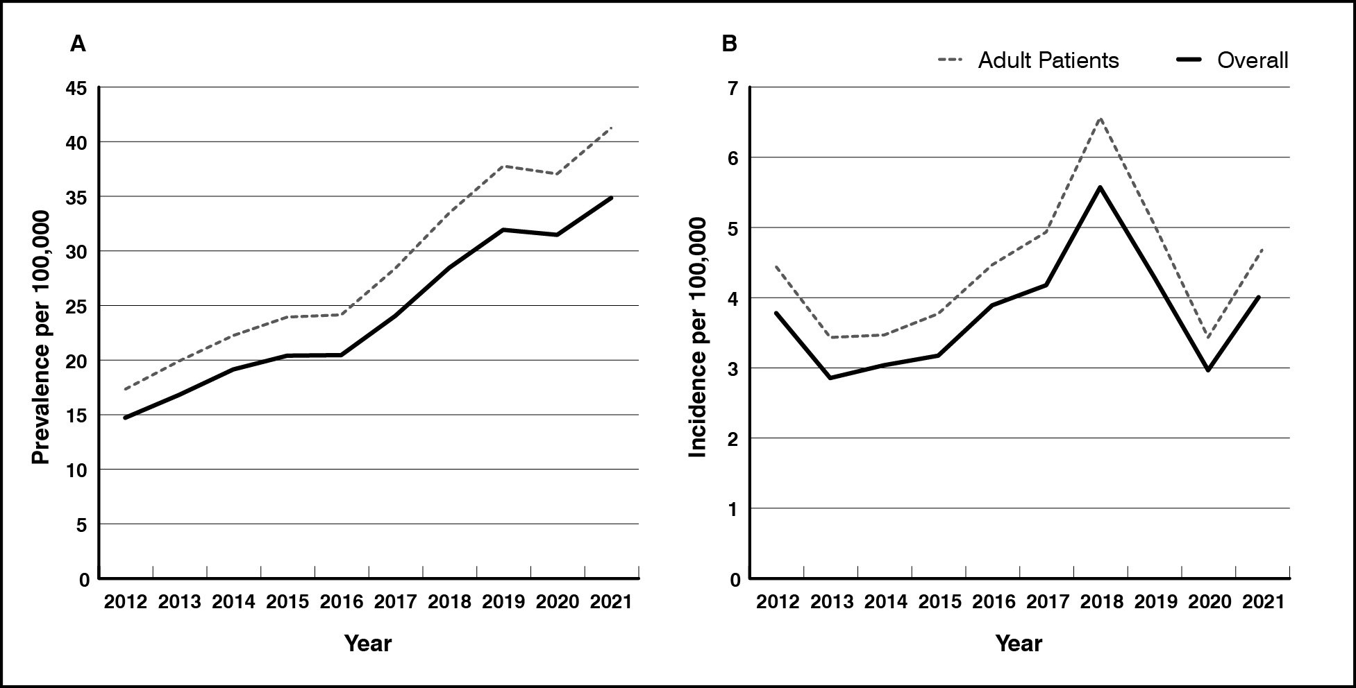 Figure 1. Prevalence (A) and annual incidence (B) of MG per 100,000 people in overall and adult population in the period 2012-2021