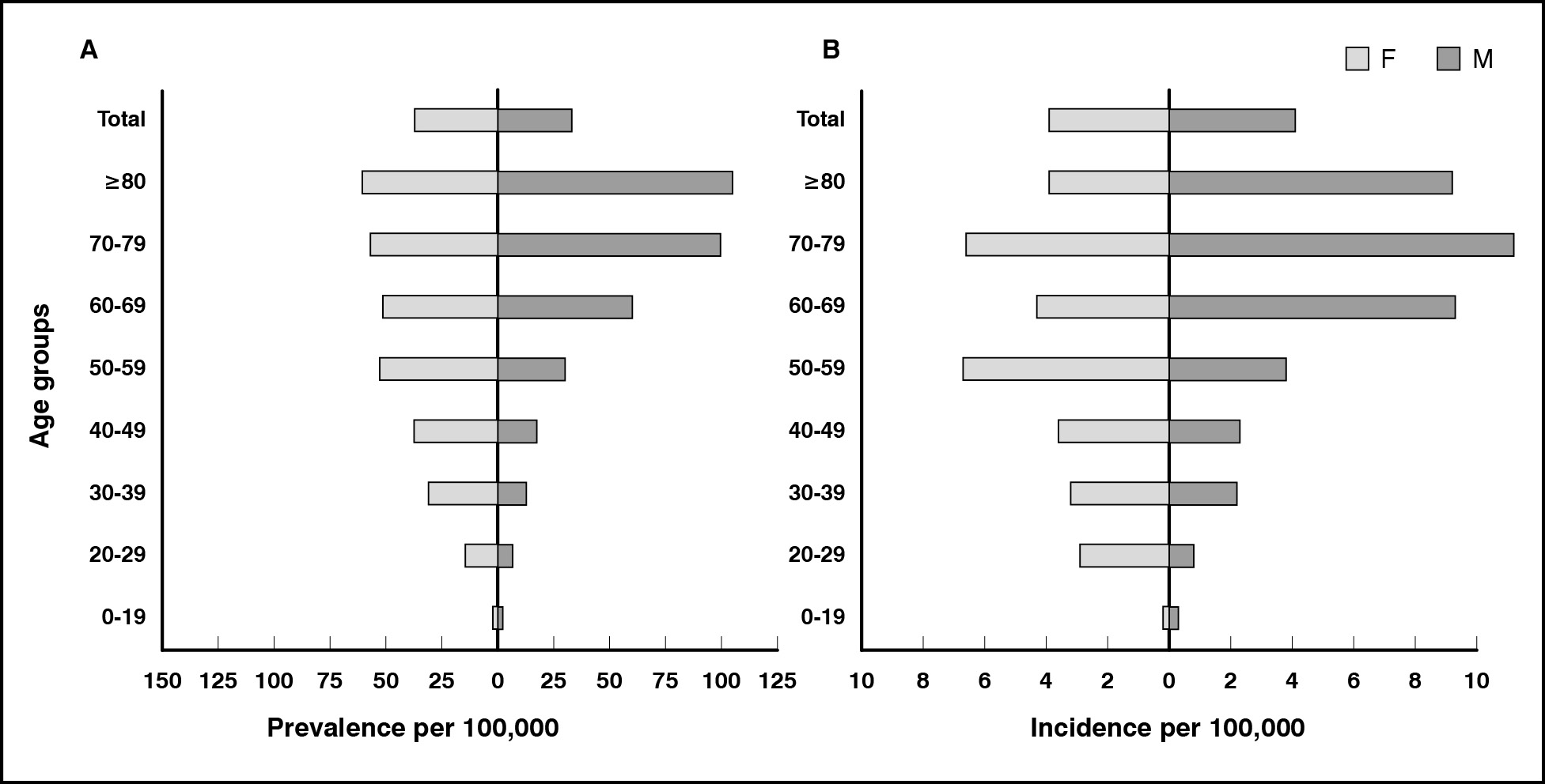 Figure 2. Prevalence (A) and annual incidence (B) of MG per 100,000 people by gender and 10-year age classes in 2021