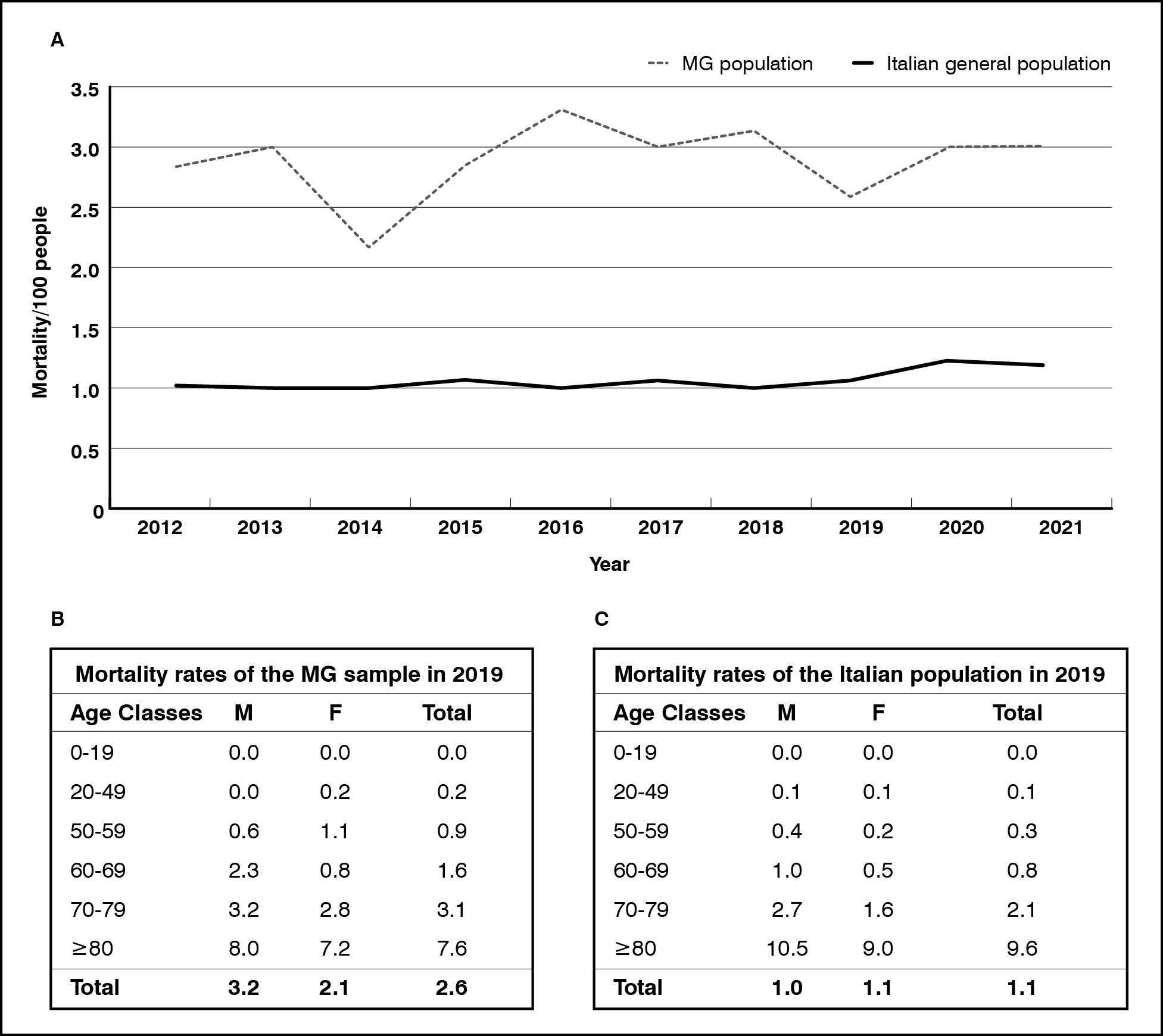 Figure 3. (A) Mortality rates per 100 people in MG sample analyzed and in the Italian general population over the period 2012-2021; (B) mortality rates per 100 people in MG sample analyzed with gender stratification in 2019; (C) mortality rates per 100 people in the Italian population with gender stratification in 2019 [27]