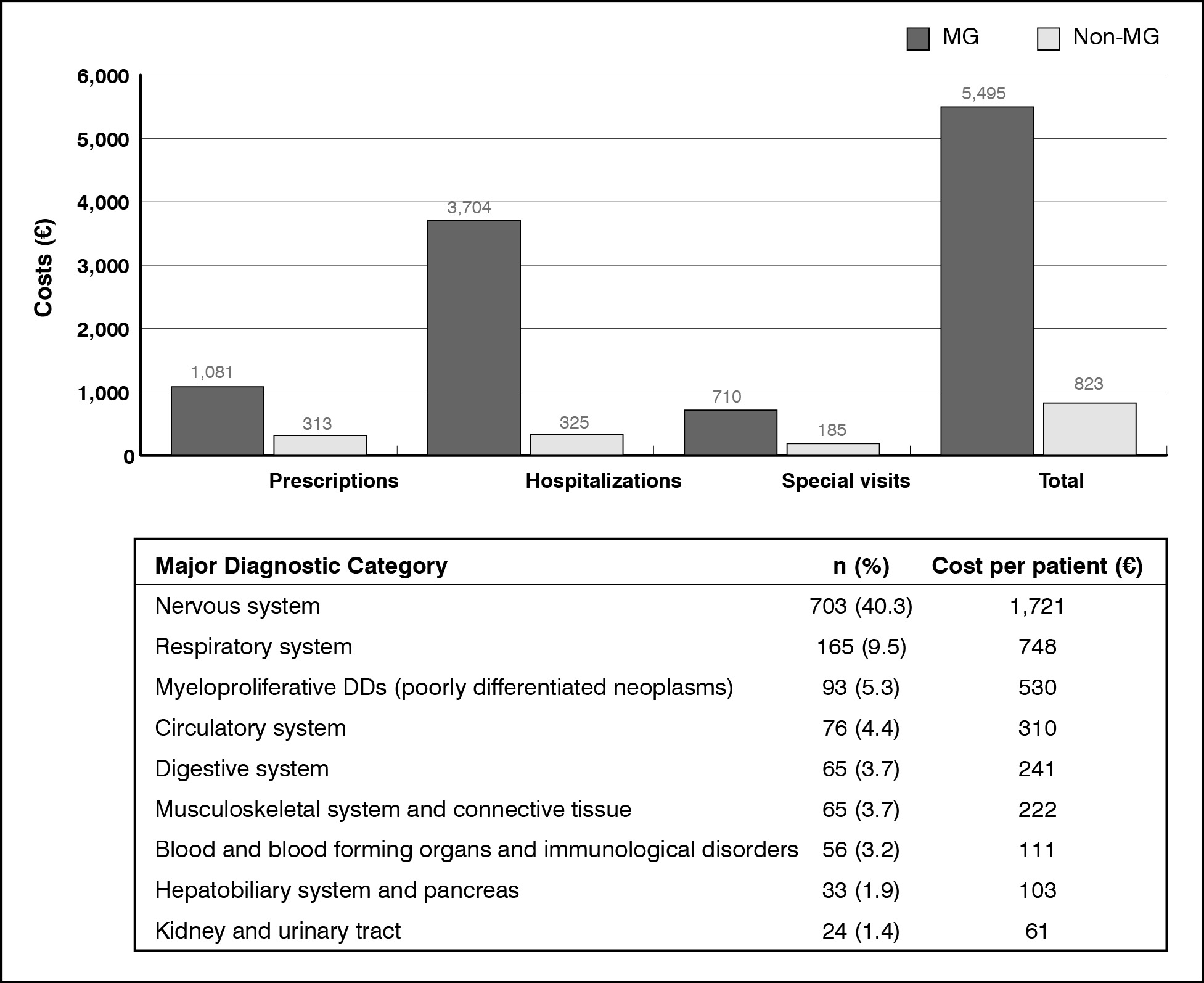 Figure 4. Average annual direct healthcare costs per patient in MG vs non-MG group at 1-year follow-up. The detail on cost distributions by hospitalization discharge diagnosis, classified according to the MDC (Major Diagnostic Category), is also reported
