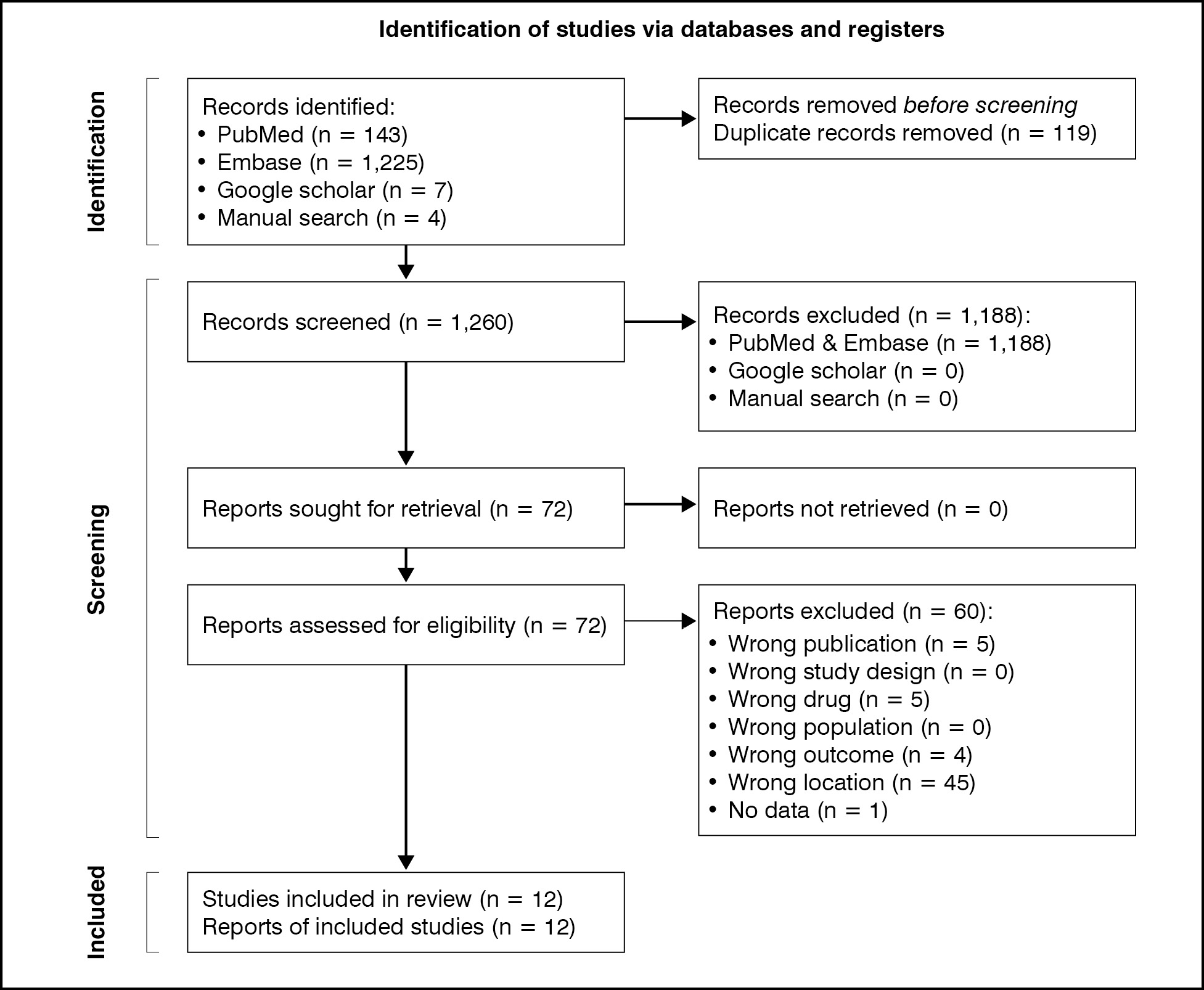 The literature search identified 1,379 studies from PubMed (n = 143), Embase (n = 1,225), Google Scholar (n = 7), and manual search (n = 4). The search results from PubMed and Embase were uploaded to Rayyan for synthesis, deleting 119 duplicate articles and leaving 1,249 studies for screening. Articles screened for eligibility were 1,260 (PubMed and Embase: n = 1,249; Google Scholar: n = 7; manual search: n = 4), excluding 1,188 (PubMed and Embase) articles in the first round of screening. Of the 72 remaining studies, 60 articles were later excluded after full-text screening. In the end, 12 studies (ten [21,23-31] non-comparative and two [20,22] comparative) that met the inclusion criteria were included in the review. The study selection process and reasons for exclusion from the review are documented in Figure 1.