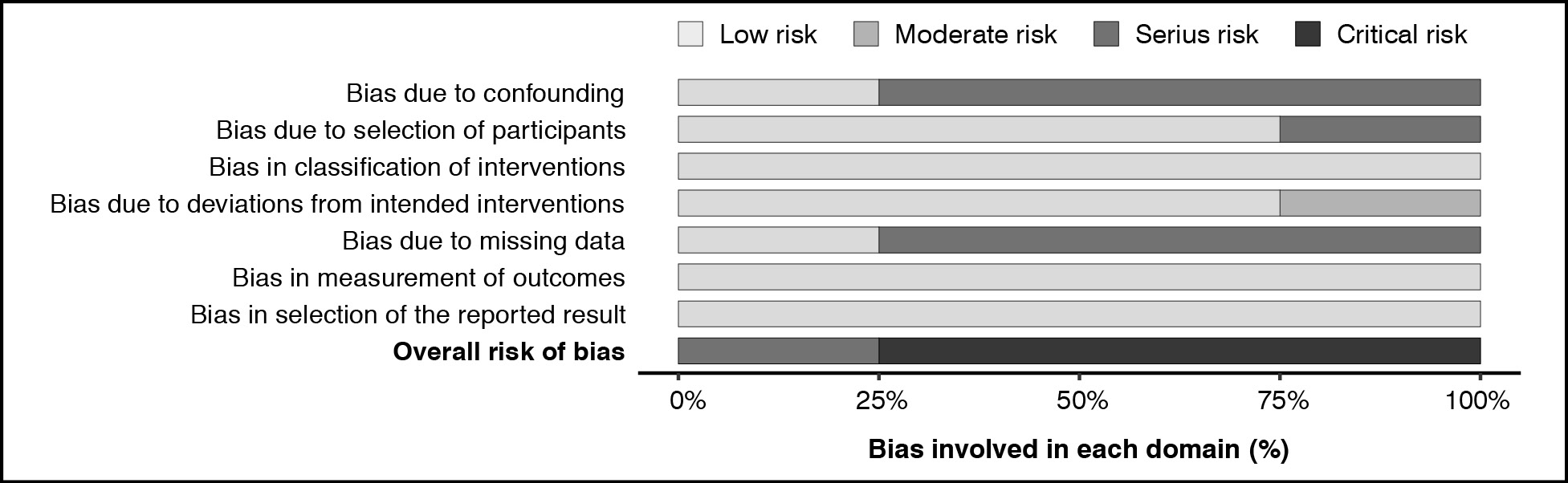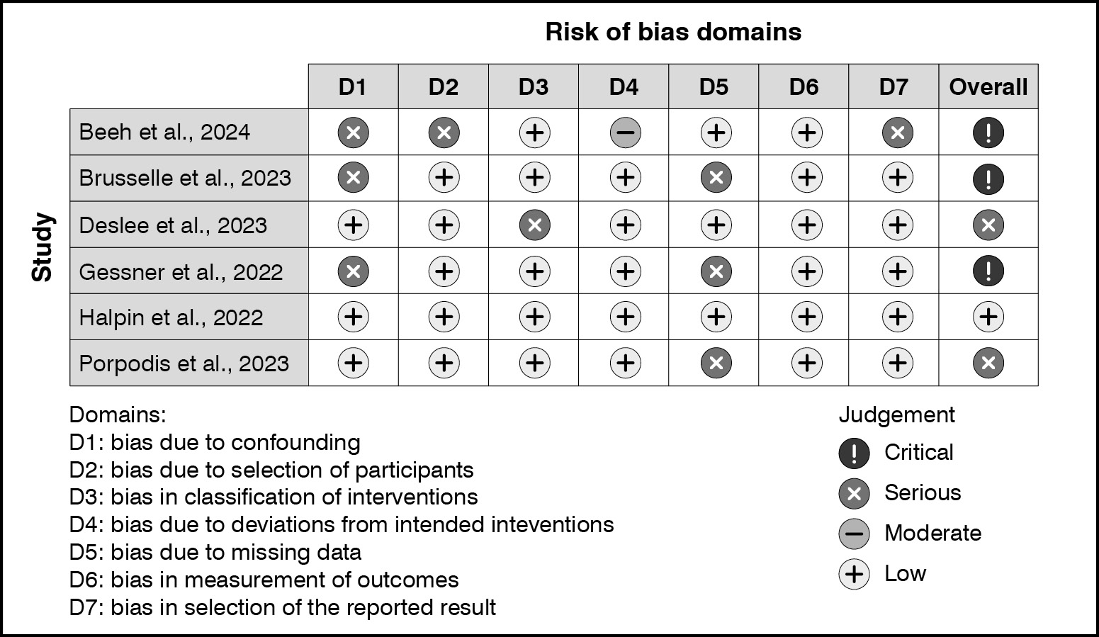 The RoB present in the four preselected outcomes was determined by how well the domains’ signaling questions were appraised, with the judgment of either Low, Moderate, Serious, or Critical applied to each domain. The outcomes’ overall RoB followed the domains’, with individual studies copying from outcomes. The RoB results were envisioned in robvis [19] (Cochrane’s web-based visualization tool for RoB assessment).