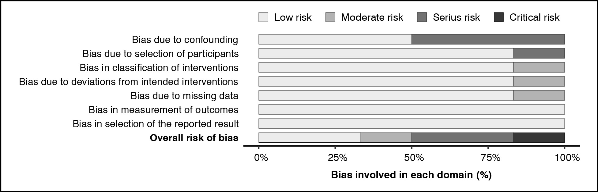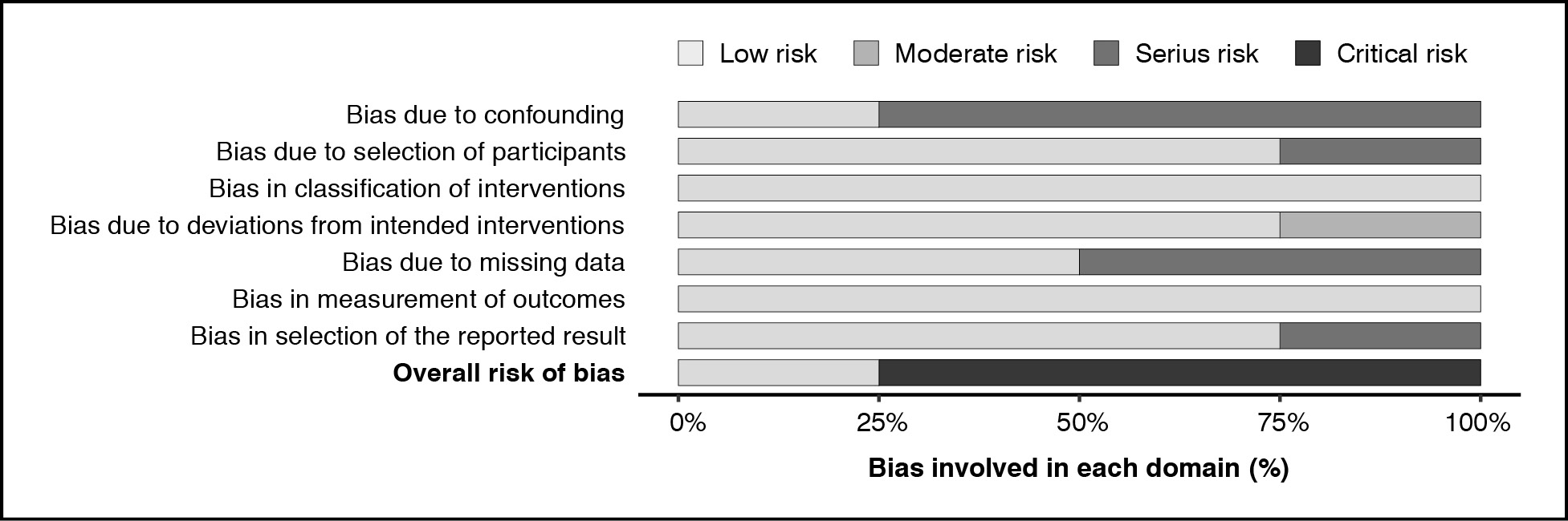 In Figure 2, serious RoB was due to confounding (three studies [21,23,28]), selection of participants (one study [21]), classification of interventions (one study [20]), missing data (three studies [23,28,30]), and selection of the reported result (one study [21]). One study [21] had a moderate RoB due to deviations from the intended interventions.