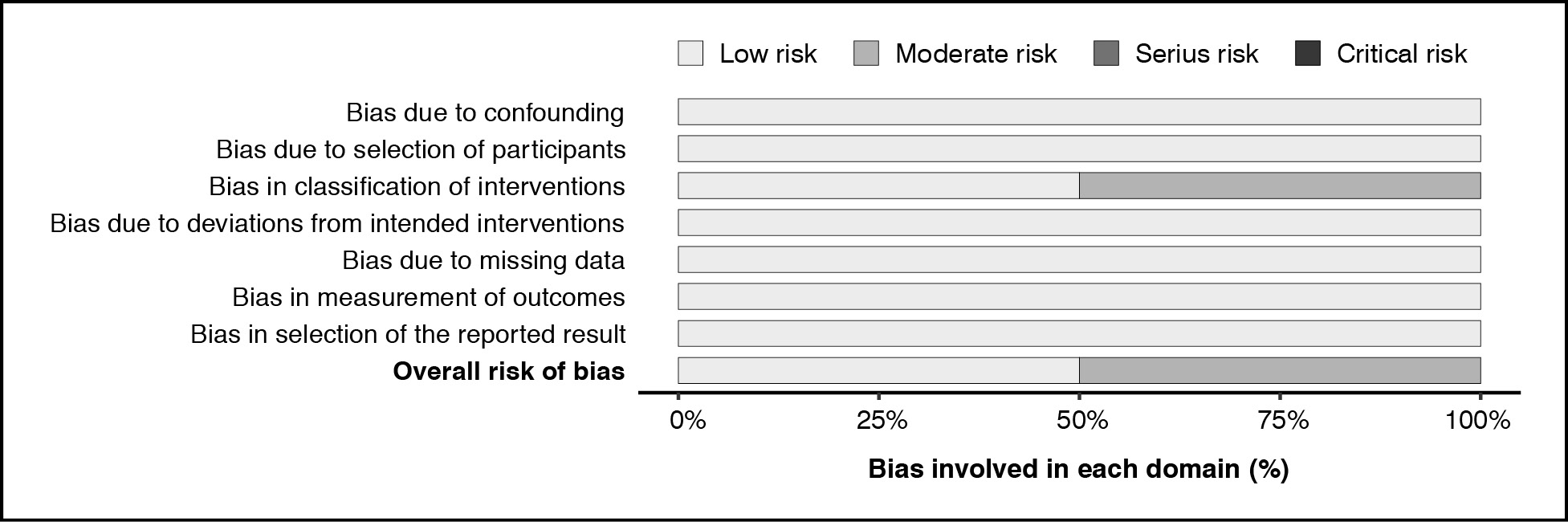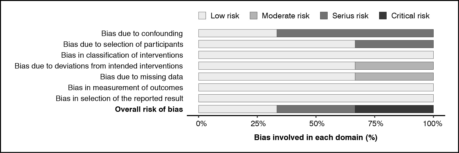 Two reviewers (LAO and MB) accomplished the risk of bias (RoB) assessment by inspecting the RoB involved in the studies using ROBINS-I [18] (Cochrane’s RoB assessment tool for non-randomized studies of interventions—NRSIs). ROBINS-I investigated bias within the seven domains of bias: i) confounding, ii) selection of participants in the study, iii) classification of interventions, iv) deviations from intended interventions, v) missing outcome data, vi) measurement of outcomes, and vii) selection of the reported result.