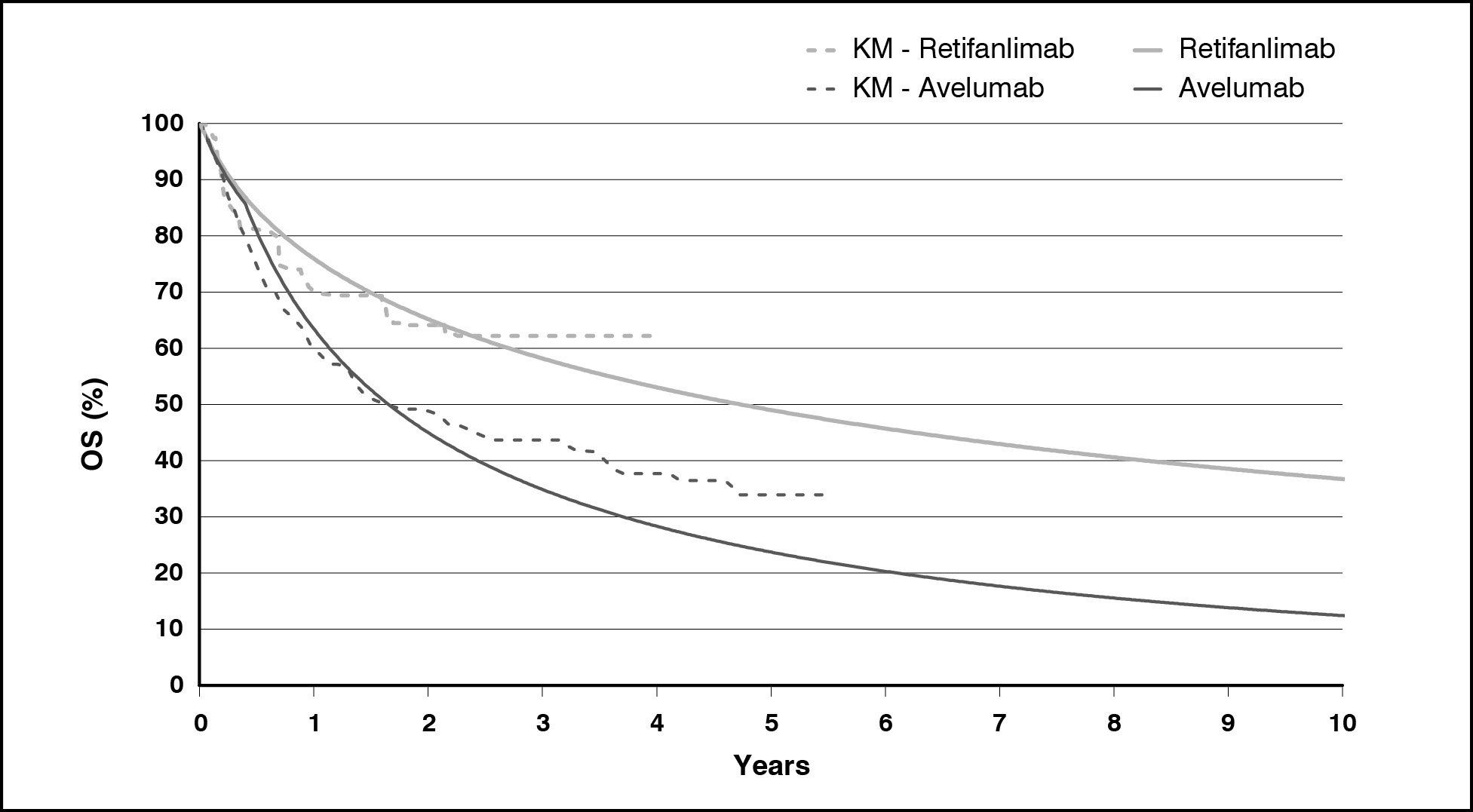 OS and PFS curves are illustrated in Figure 2 and Figure 3. Regarding OS for retifanlimab, the log-normal, Gompertz, and generalized gamma distributions had similar AIC and BIC values. In the base case, the log-normal distribution was selected because it provided more conservative survival estimates compared to the other two distributions (Supplementary Material Table S2). The impact of this assumption was further evaluated in the scenario analysis. Despite analytic tests indicating that the proportional hazards assumption was not violated, visual assessment of the Kaplan-Meier plot (Figure 2) suggested evidence of a deviation from the proportional hazards assumption and time-dependent hazard ratios were therefore used. Time-dependency was implemented by splitting the follow-up time into two intervals and calculating a single constant HR within each interval. A 5-month split was chosen based on visual assessment of the cumulative hazard plot. Thus, the OS curve for avelumab was modelled with two distinct HRs: 1.092 during the first 5 months and 2.243 for the subsequent period [12]. The impact of this assumption was further investigated in the scenario analysis.