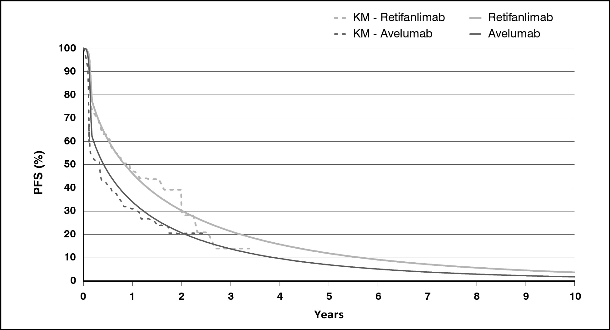 The PFS curve for retifanlimab was modelled using a time-dependent distribution, as visual inspection of the Kaplan-Meier curve (Figure 3) revealed a high risk of progression and death during the initial months, which subsequently decreased. The assumption of proportional hazards in the analysis of PFS was not satisfied and time-dependent hazard ratios were therefore used. A 2-month split was chosen based on visual assessment of the cumulative hazard plot. Thus, the PFS curve for avelumab was estimated using HRs of 2.145 for the first 2 months and 1.168 for the subsequent period [12].