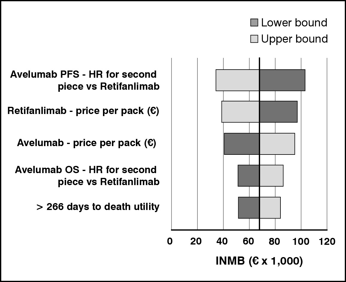 The results of the DSA are presented using a tornado diagram, highlighting the key model parameters influencing the incremental net monetary benefit (INMB) (Figure 4). This was computed considering a willingness to pay of €33,000 per QALY, in line with the drug reimbursement threshold reported in Italy [26]. The analysis showed that the INMB was sensitive to variations in drug pricing and the HRs used to estimate avelumab’s efficacy.