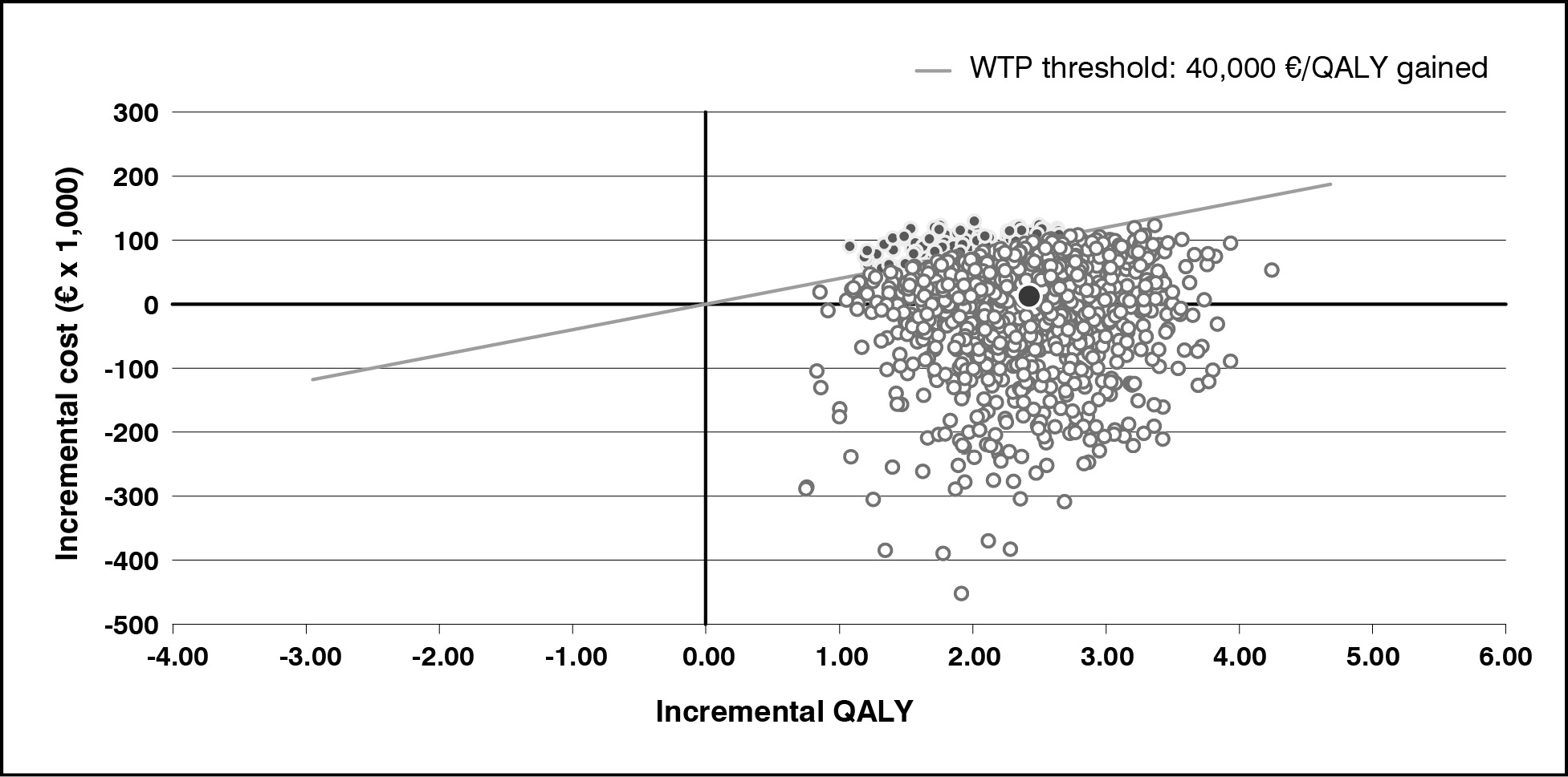 To evaluate the overall uncertainty across all model parameters, a probabilistic sensitivity analysis (PSA) was conducted with 1,000 iterations. In each iteration, parameters were varied simultaneously and randomly, according to their probability distributions and the model outputs were recalculated.