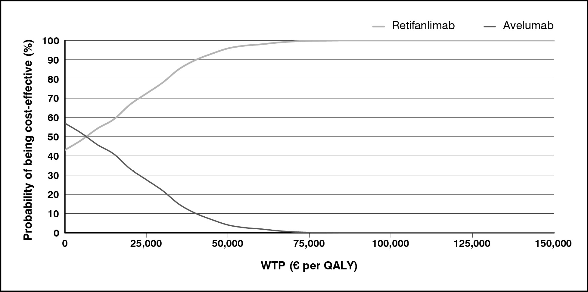 RESULTS: In the base case, retifanlimab demonstrated greater efficacy compared to avelumab, with 6.39 vs 3.42 life-years and 5.11 vs 2.68 quality-adjusted life-years (QALYs), at an additional cost of €12,228. The incremental cost-utility ratio was estimated at €5,037 per QALY gained. Sensitivity analyses confirmed the robustness of the base case results.