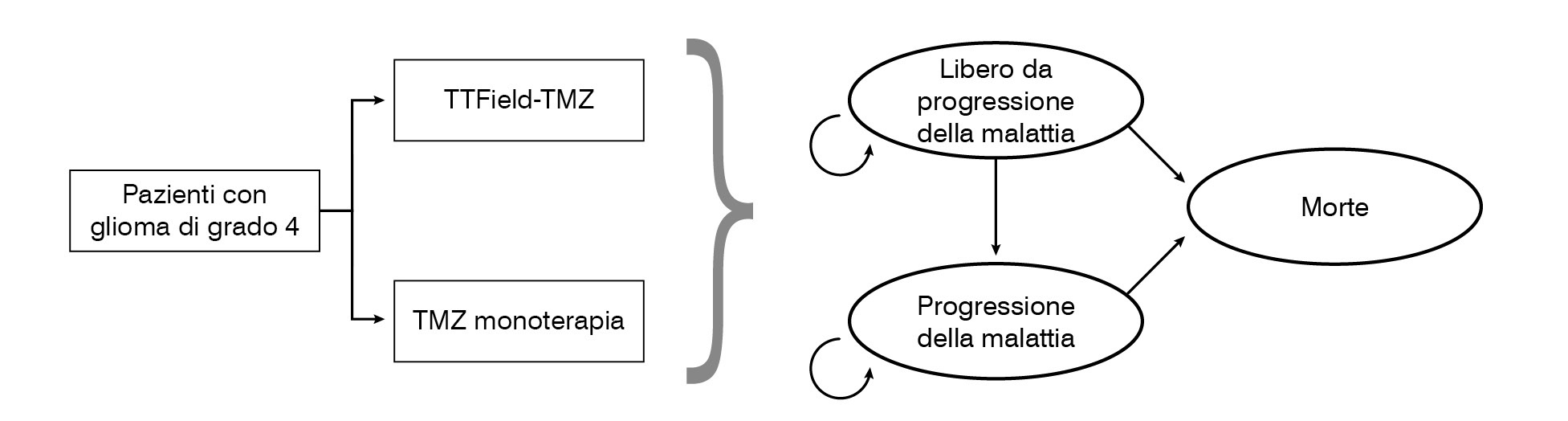 Nel modello sono state confrontate due strategie di trattamento: TTFileds-TMZ e TMZ in monoterapia. La durata dei due trattamenti è stata ricavata da quanto emerso nel trial pivotal EF-14 [19]. Nello specifico per il trattamento con TTFields-TMZ è stata considerata una durata di trattamento pari 8,2 mesi (6,6-9,8 mesi) mentre per la durata del trattamento con TMZ in monoterapia è stata considerata una durata di trattamento pari a 7,2 mesi (5,8-8,6 mesi).