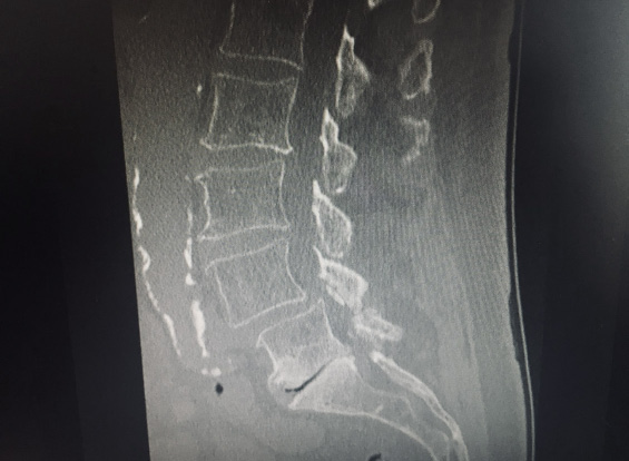 Computed tomography (CT) myelogram 1 month ago showed severe L4-L5 central and foraminal spinal stenosis with complete spinal canal effacement, as well as severe facet arthropathy and multi-level degenerative joint disease (DJD). CT imaging of the lumbar spine taken at that same time is shown in Figure 1.